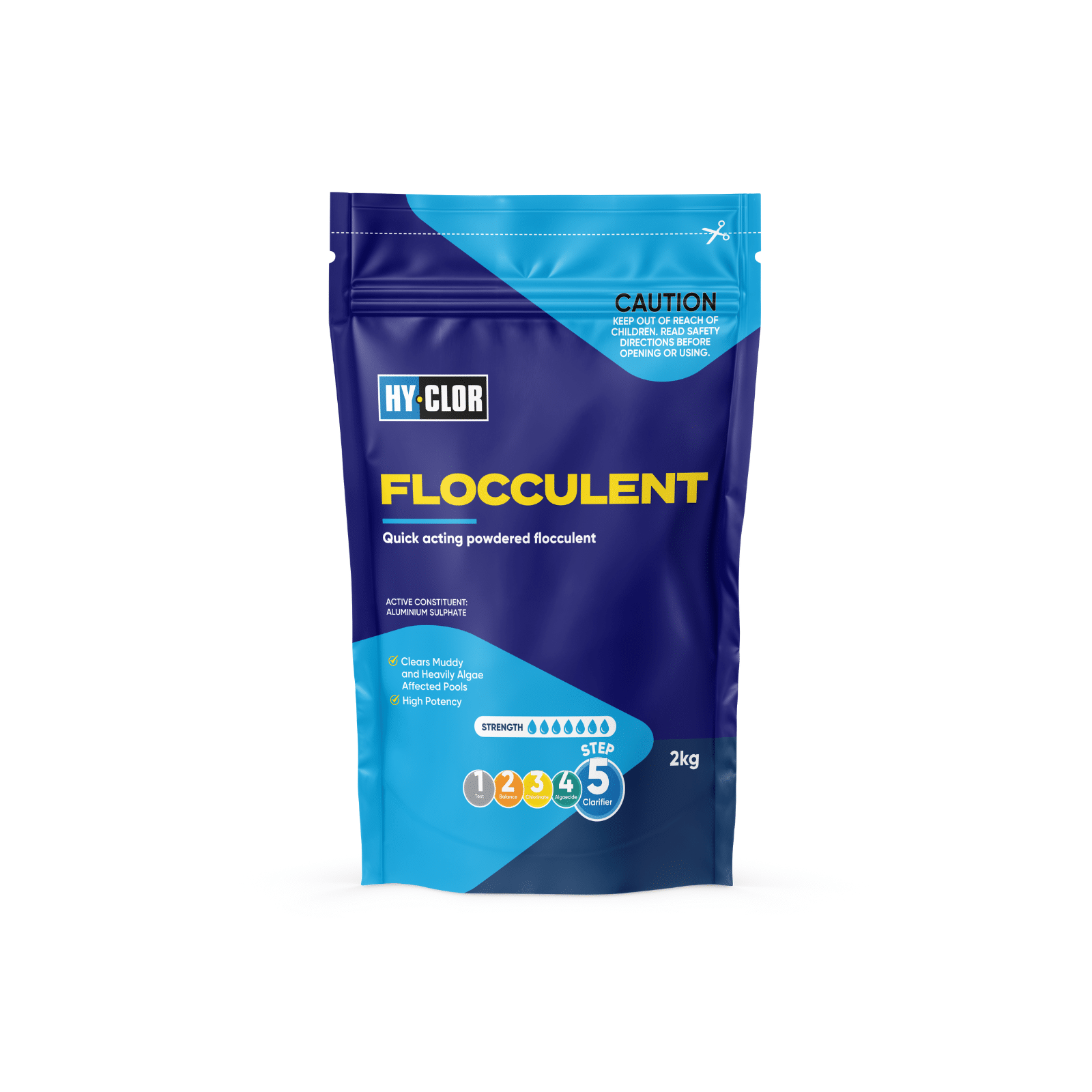 Pool flocculent works in much the same way, however it is generally used when the pool is so cloudy you can’t see to the bottom the pool. Pool flocculent thickens the particles in suspension and binds them together, so they sink to the floor. Following this you then vacuum the particles to waste.