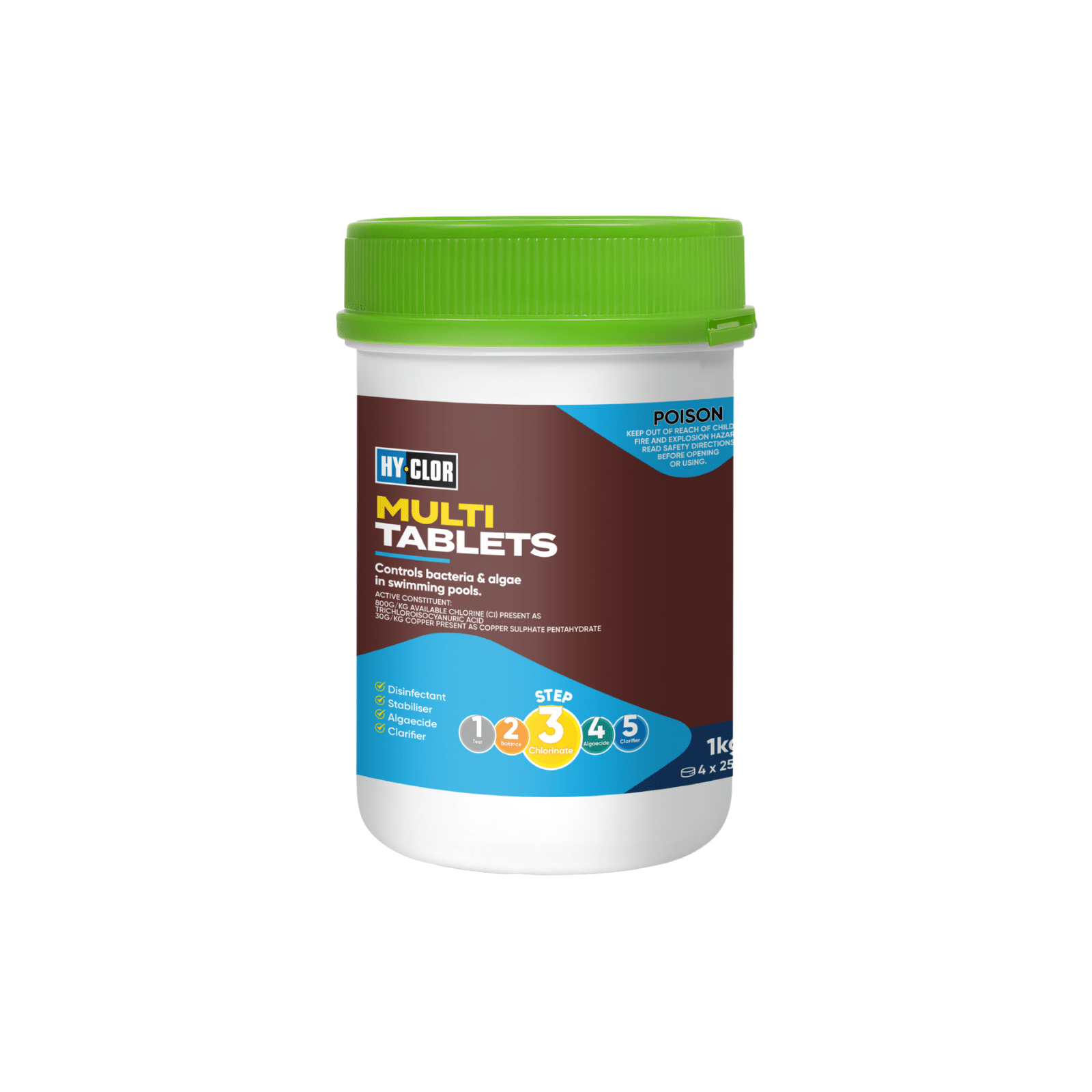 Stabilised tablets contain cyanuric acid to protect chlorine from sunlight, making them perfect for outdoor pools. Unstabilised versions are best used for indoor pools or quick boosts of chlorine. Hy-Clor does not offer unstabilised tablets. For unstabilised chlorine use liquid chlorine or unstabilised granular chlorine.