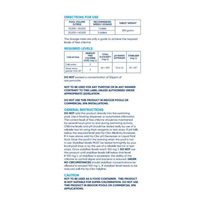 High Performance pool tablets should be used in a floating dispenser or inline tablet feeder. This product keeps your water safe from viruses and bacteria. In-built UV protection for longer life in outdoor pools.