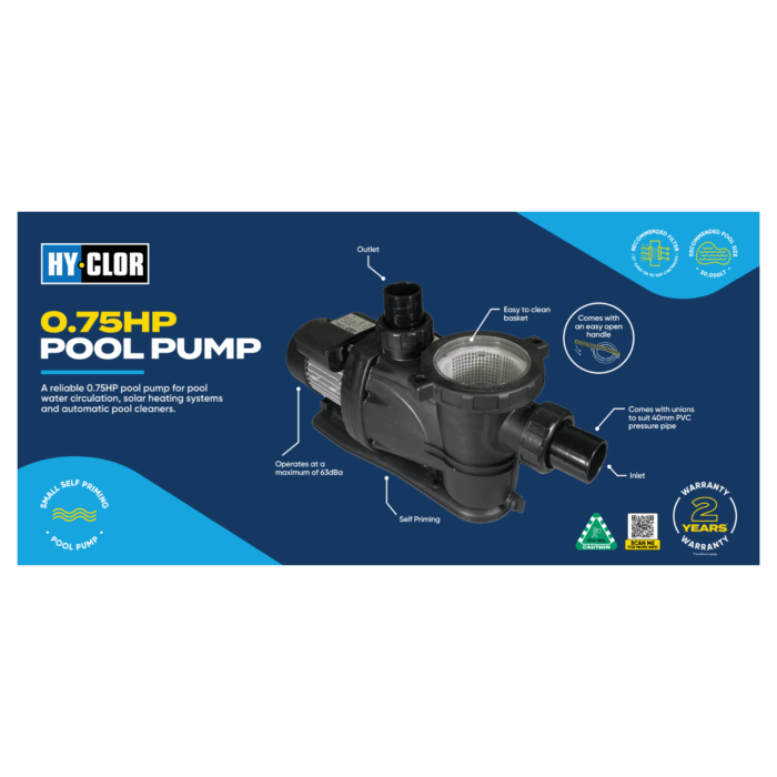 Introducing the Hy-Clor 0.75HP Pool Pump, the essential solution for small residential pools that demand reliable performance. Designed to ensure seamless water circulation, this robust pump is the perfect companion for a range of pool functions including filtration, chlorination, spa jets (max 4), waterfalls, and solar heating applications. It operates flawlessly in both chlorine and saltwater pools, making it a versatile choice for pool owners.