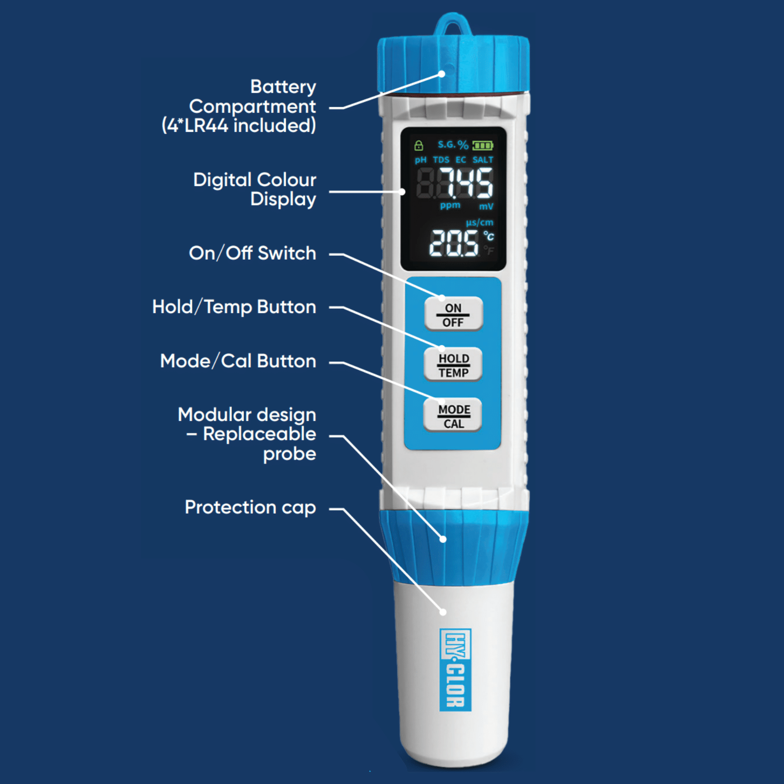 Hy-Clor 7 in 1 Multi Test Pen is a digital water testing probe designed for pools and spas. Delivering fast, accurate readings to help maintain balanced water quality. It’s both waterproof and dustproof, and comes ready to use with 1.5V (LR44) batteries included.
