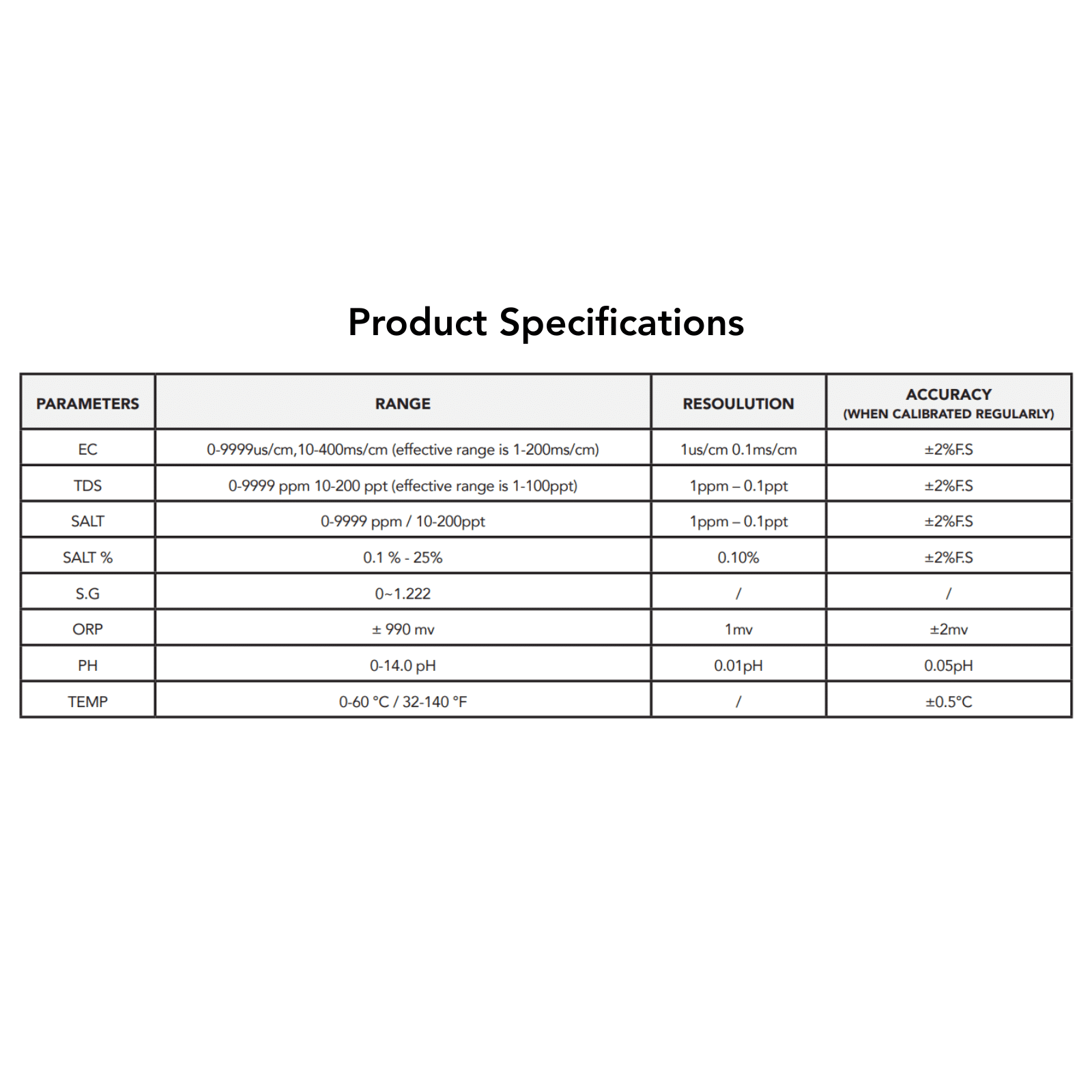 – TDS: Total dissolved solids (0-9999ppm 10-200ppt) (effective range is 1-100ppt)