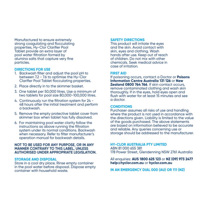 - Backwash filter and adjust the pool pH to between 7.2 – 7.6 to optimise the Hy-Clor Clarifier Pool Tablet flocculating properties.