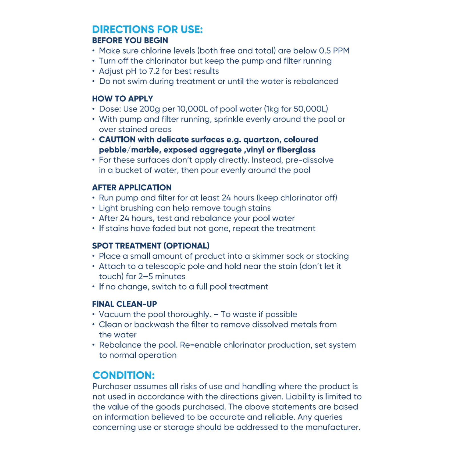 - With pump and filter running, sprinkle evenly around the pool or over stained areas