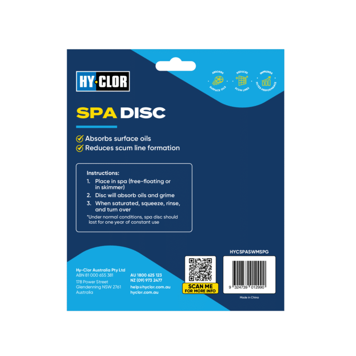 Hy-Clor Spa Disc is designed specifically for use in spas and hot tubs. The spa disc works to absorb body fats, oils and suntan lotions left behind in your spa. It also aids in removing the build-up that causes scum lines.