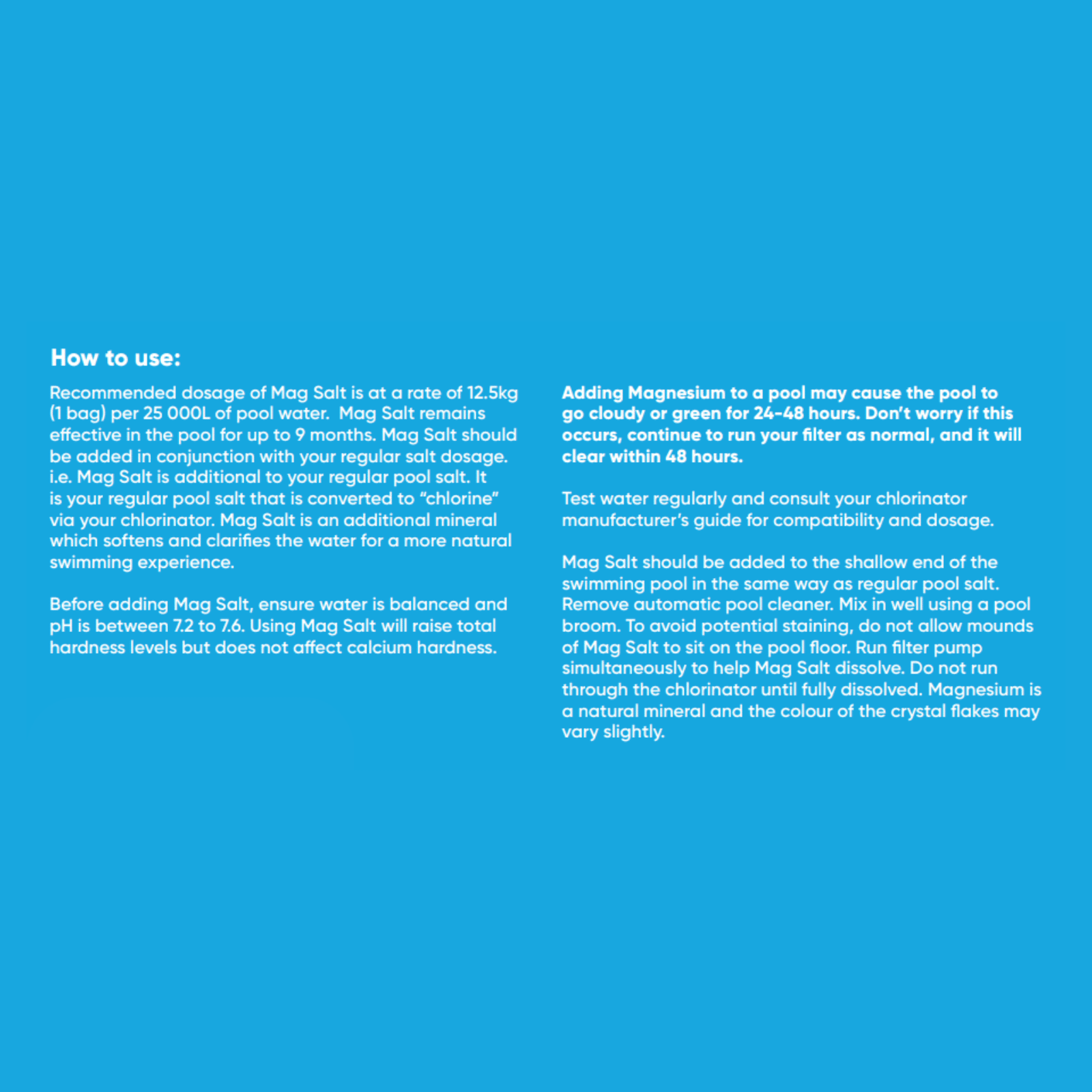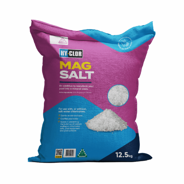 High purity natural magnesium salt which helps reduce the need for clarifiers and algaecides, softens and smooths pool water. Magnesium adds a natural flocculent to help pool water stay clear, aid filtration and reduce chlorinator running times.