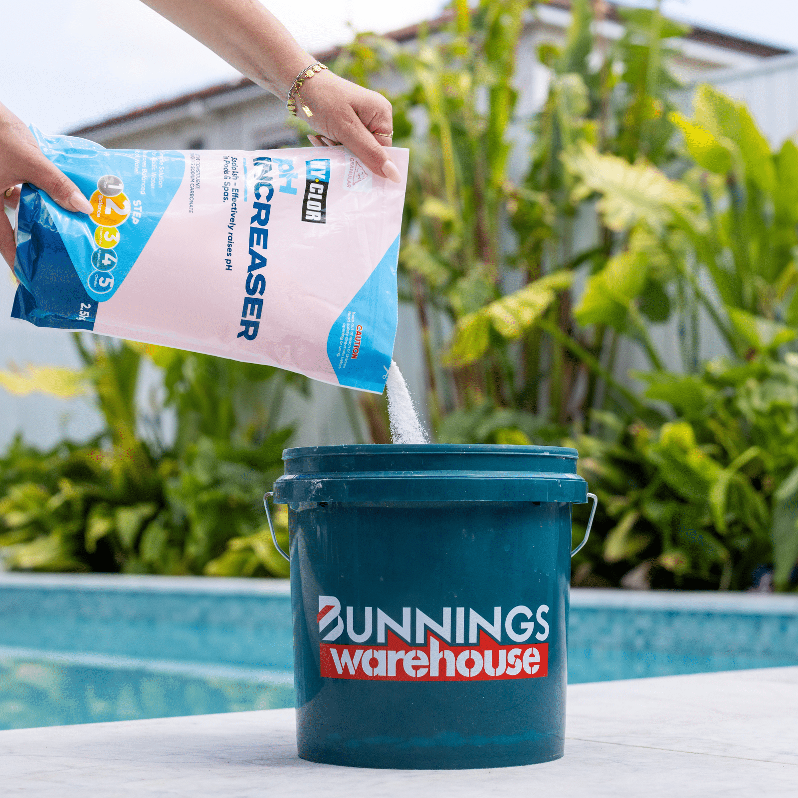 - Dissolve product in a bucket of water and distribute evenly around the edge of the pool