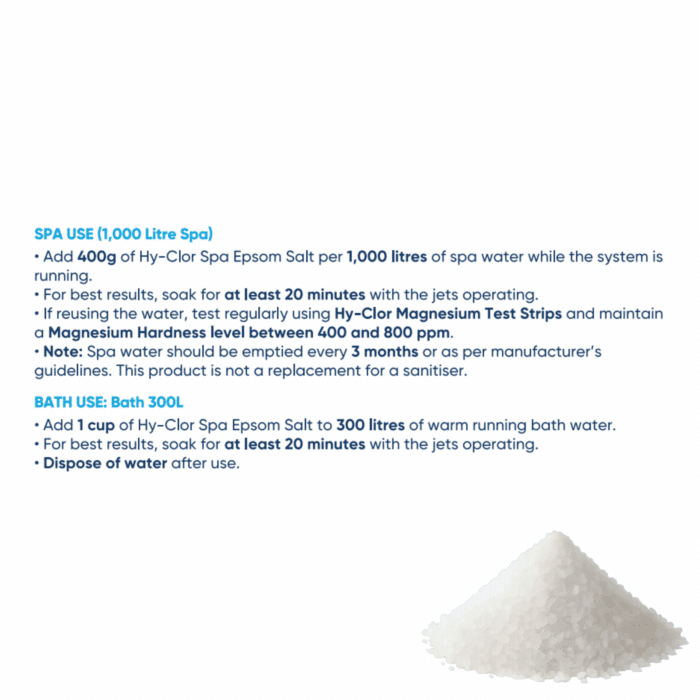 Spa Use 1,000L: Pour one cup of Hy-Clor Spa Epsom Salt per 300L of the spa water. For optimum relaxation, soak for a minimum of 20 minutes with the jets on.