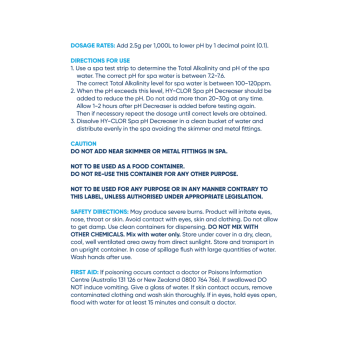 - When the pH exceeds this level, Hy-Clor’s spa pH decrease should be added to reduce the pH – Do not add more than 20 – 30g at any time – allow 1 – 2 hours after pH decreaser is added before testing again