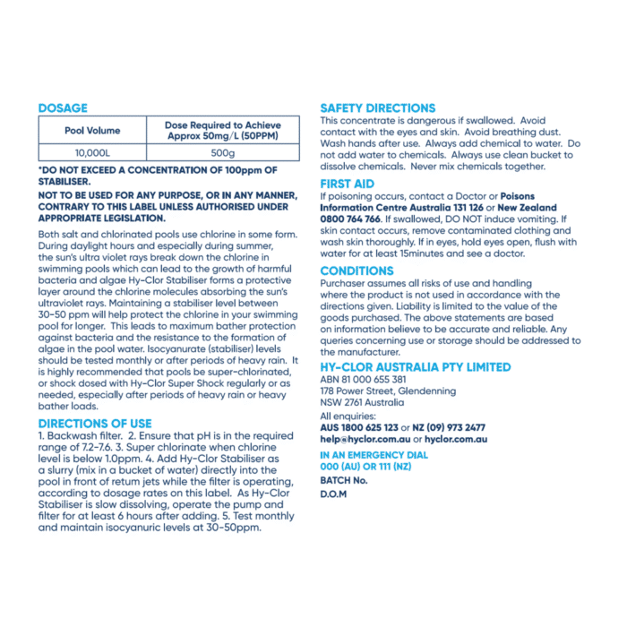 - Do not exceed a concentration of 100mg/L (100ppm) of stabiliser